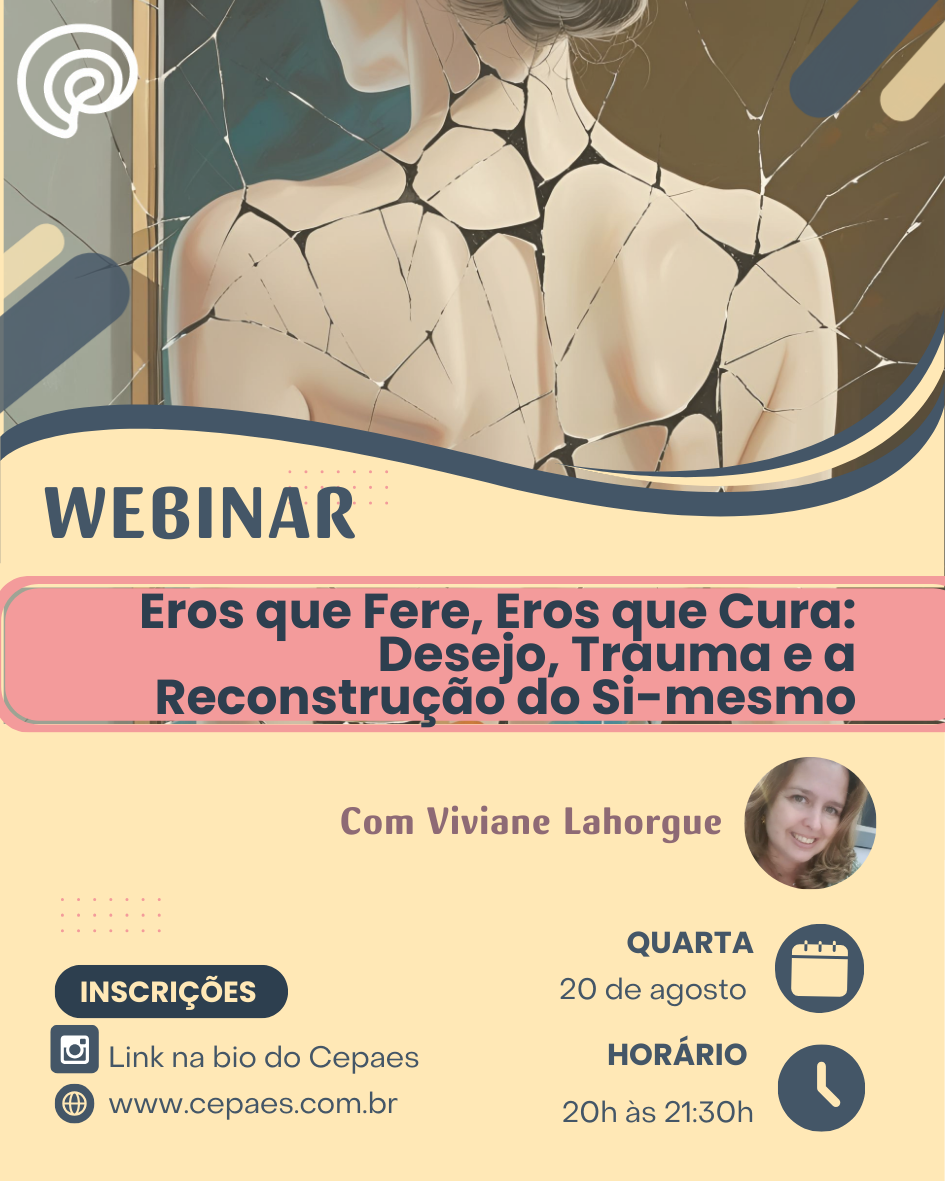 O Webinar ” Eros que fere, Eros que Cura: Desejo, Trauma e reconstrução do Si-mesmo.” aconteceu no dia 20 de agosto de 2025, sendo ministrado pela Prof. Viviane Lahorgue